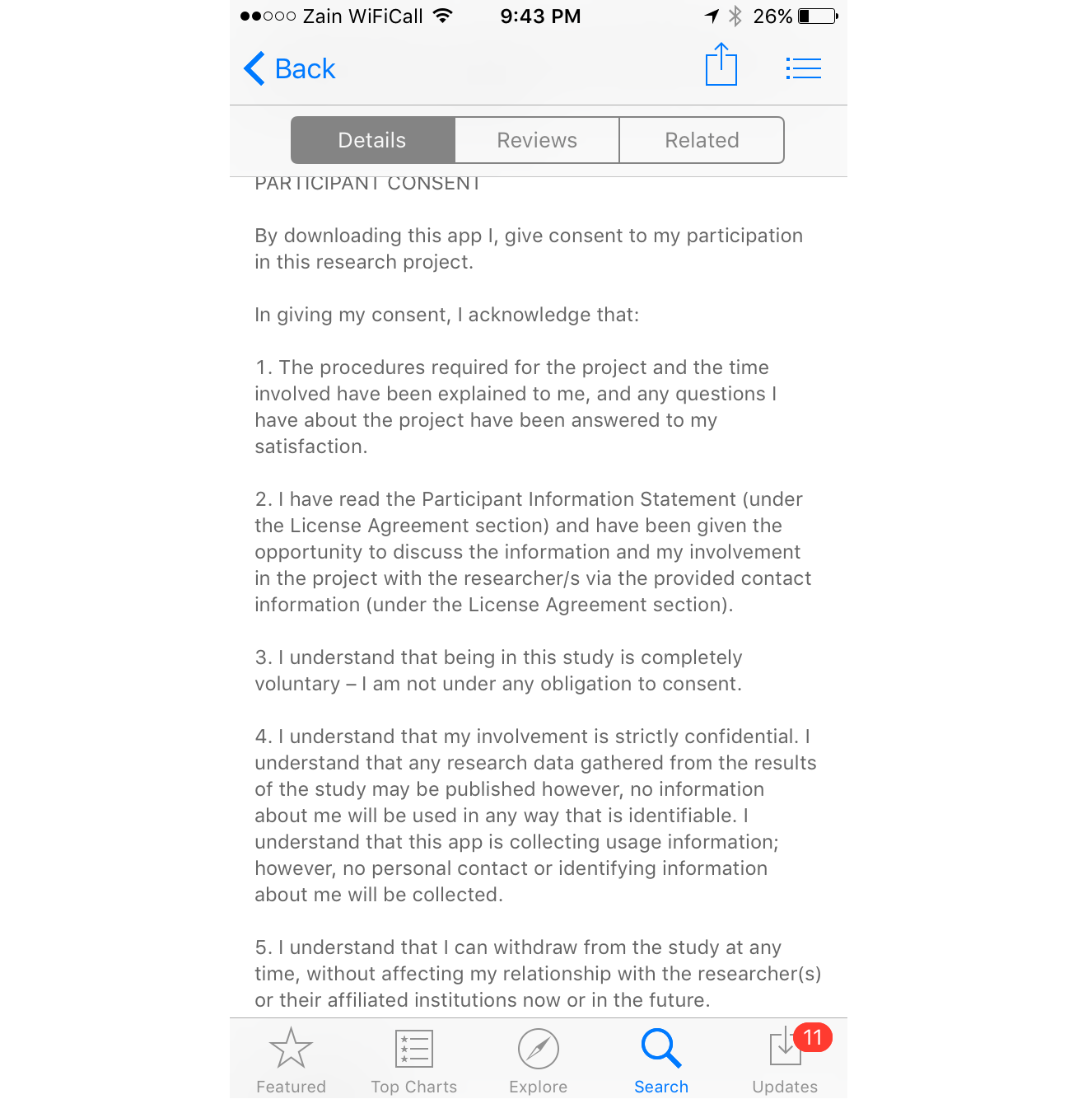 Apple App Store users aged 18 or above, from the 5 nominated countries were recruited directly via the app’s download page in the Apple App Store. The consent and participants’ information are summarized in the app download page () and are included in the “about” section of the app. The studied app was published during the recruitment period (January 25 to March 25, 2015) to the Apple App Store, which was the main portal for advertising this study’s app. In addition, to boost the recruitment process, we advertised the app with demographic targeting (by country) using an in-app advertisement, that results in the app ad being displayed to Apple iPhone users while they are using other apps.
