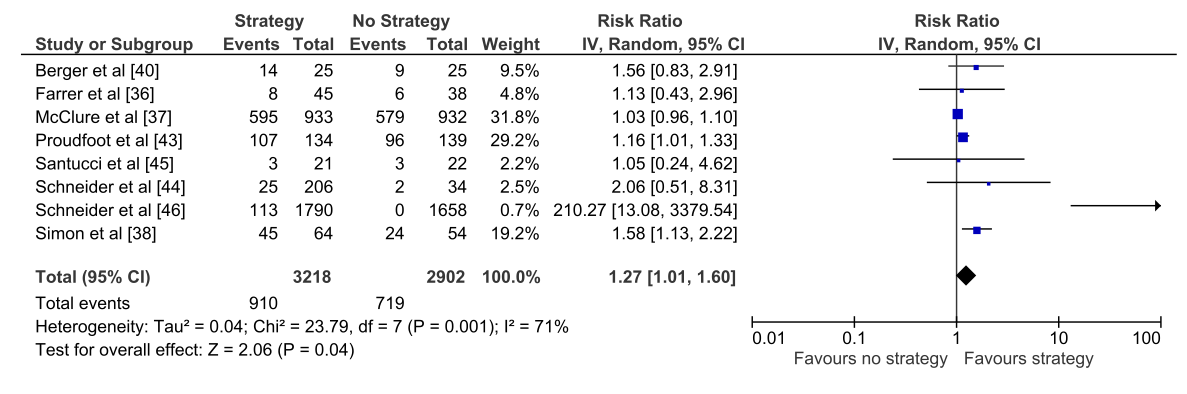 The main strengths of this review are the rigorous and systematic methodology, which followed Cochrane methodological guidance, and the comprehensive and extensive search strategy. Furthermore, screening, extraction, and risk of bias assessment were independently conducted or reviewed by at least two authors. The review also includes meta-analyses to measure the effect of using the strategies compared to no strategies. In addition, the published, peer-reviewed protocol provides transparency.